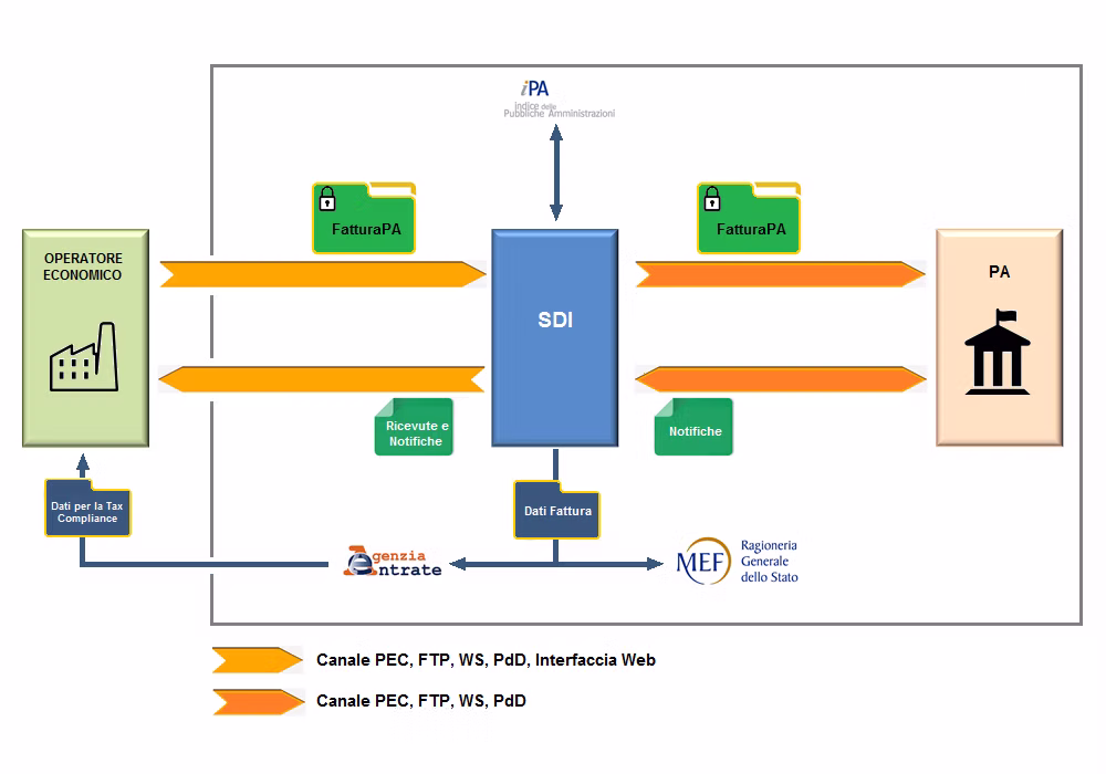 According to the image, e-invoices sent/received from businesses to SdI, from SdI to public administration (and vice versa) are processed through 4 different channels.